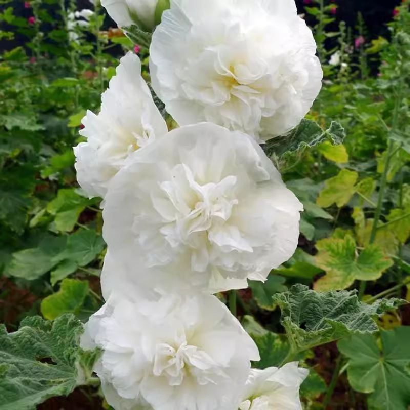 Hollyhock is a hardy biennial flowering plant that produces fully-double scarlet, pink, white, purple, brown and yellow flowers on sturdy spikes.